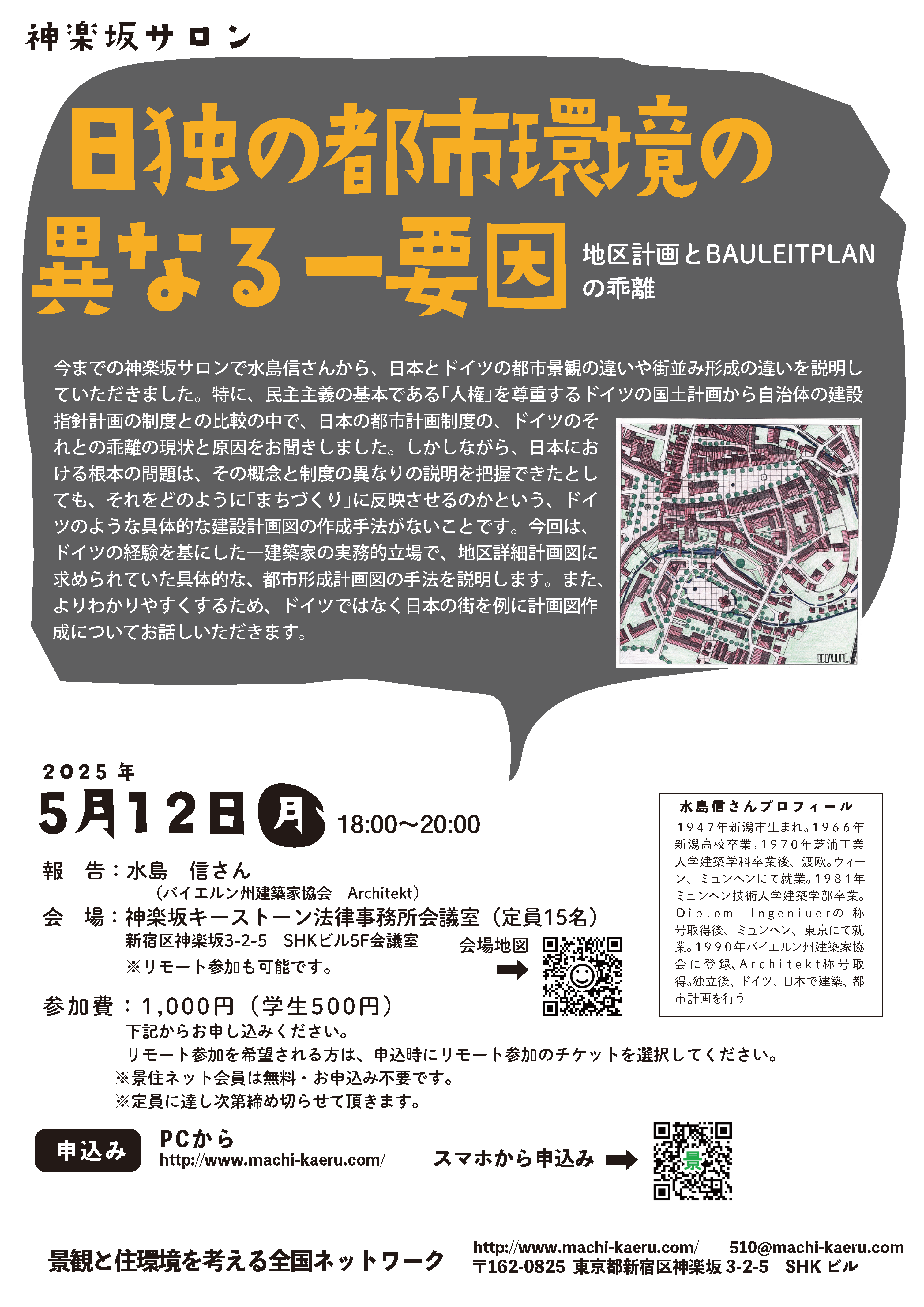 今までの神楽坂サロンで水島信さんから、日本とドイツの都市景観の違いや街並み形成の違いを説明していただきました。特に、民主主義の基本である「人権」を尊重するドイツの国土計画から自治体の建設指針計画の制度との比較の中で、日本の都市計画制度の、ドイツのそれとの乖離の現状と原因をお聞きしました。しかしながら、日本における根本の問題は、その概念と制度の異なりの説明を把握できたとしても、それをどのように「まちづくり」に反映させるのかという、ドイツのような具体的な建設計画図の作成手法がないことです。今回は、ドイツの経験を基にした一建築家の実務的立場で、地区詳細計画図に求められていた具体的な、都市形成計画図の手法を説明します。また、よりわかりやすくするため、ドイツではなく日本の街を例に計画図作成についてお話しいただきます。